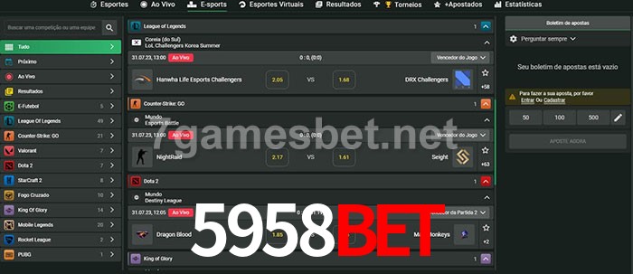 O 5958Bet oferece uma grande seleção de opções de apostas em e-sports com probabilidades competitivas